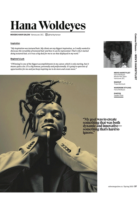 Salon Magazine Spring 2025 spotlighting Hana winning the Contessa Award for Men’s Hairstylist. Images from @hairbyhanaw.